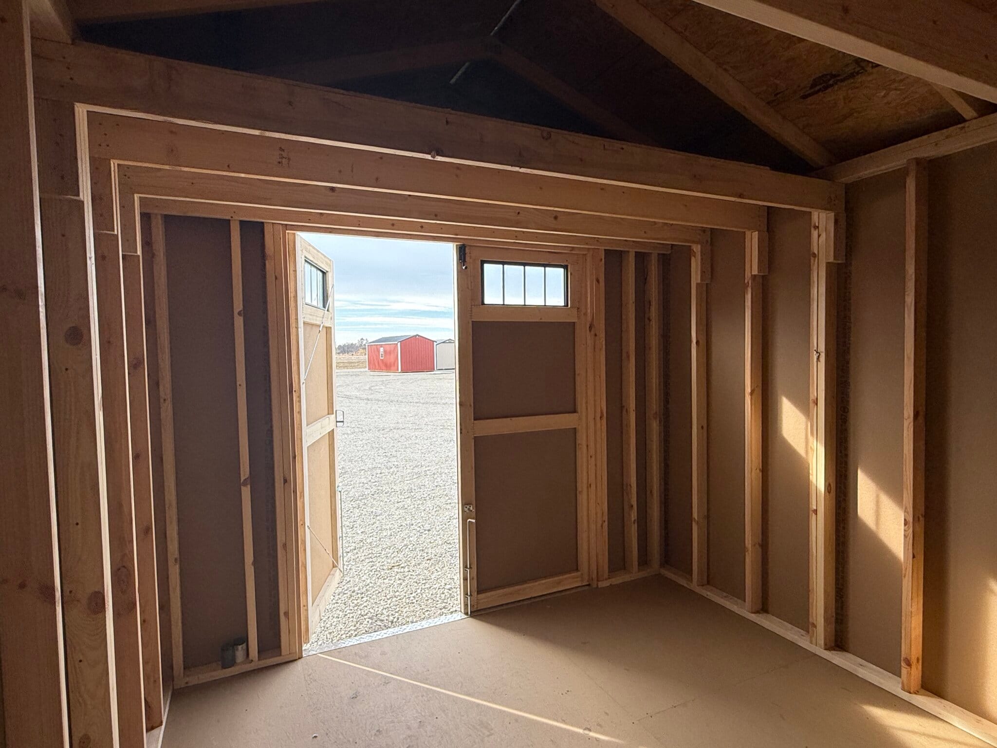 The lofted roof design creates valuable upper storage space — perfect for seasonal items, totes, hunting gear, and anything you want out of the way but still accessible.